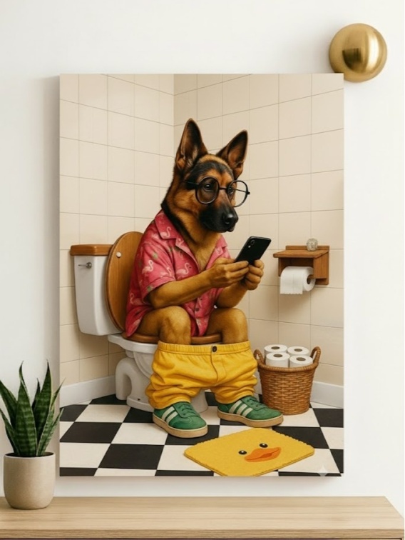 Przemień swojego psa w gwiazdę codziennych sytuacji! 🐶📱 Humorystyczny, personalizowany portret psa na toalecie – idealna dekoracja do łazienki i wyjątkowy prezent dla miłośników pupili.